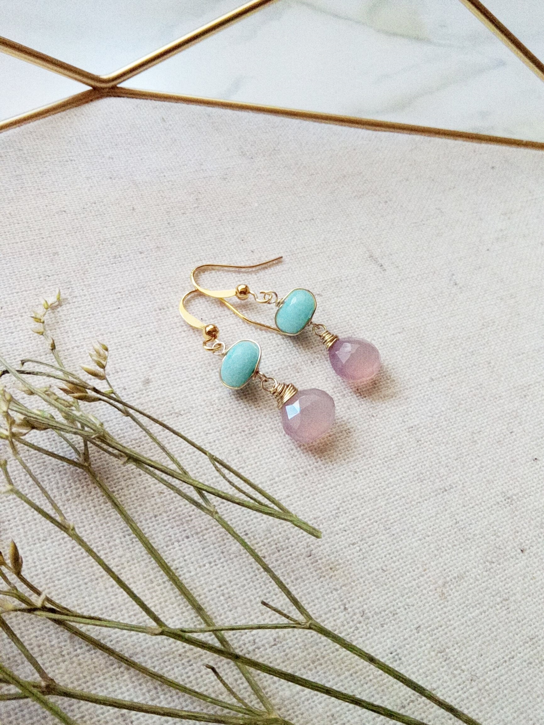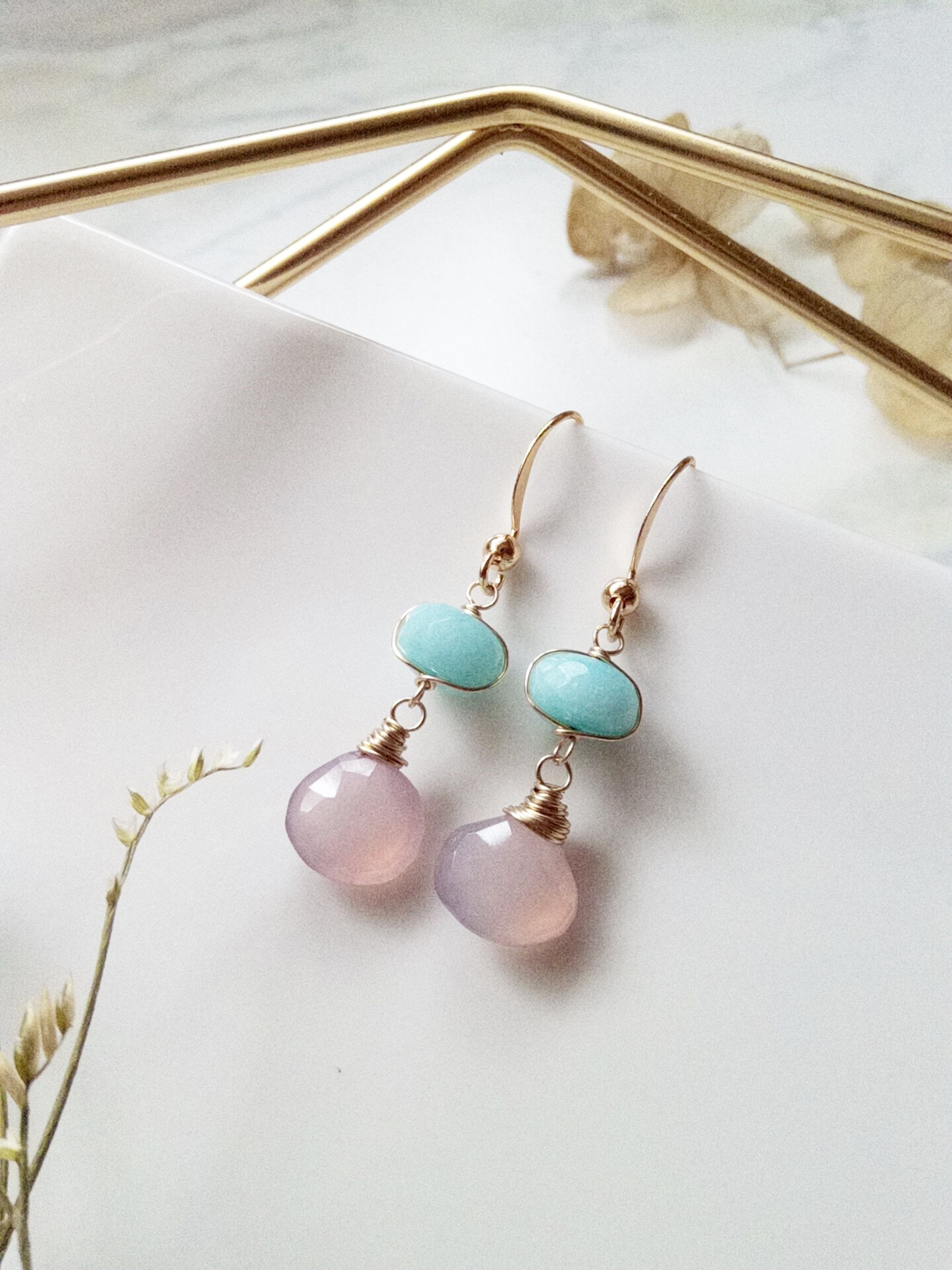 Discover the delicate allure of candy-colored chalcedony gemstones, reminiscent of sweet drops that brighten any jewelry piece. These stones offer gentle pastel hues that enhance designs with subtle vibrancy and unique translucency. Ideal for creating refined, elegant accessories, their soft yet rich colors add a sophisticated charm suitable for both everyday wear and special occasions. Embrace the natural beauty and versatile appeal of these chalcedony gemstones to elevate your collection. Suspends off a gold filled Ear wire.