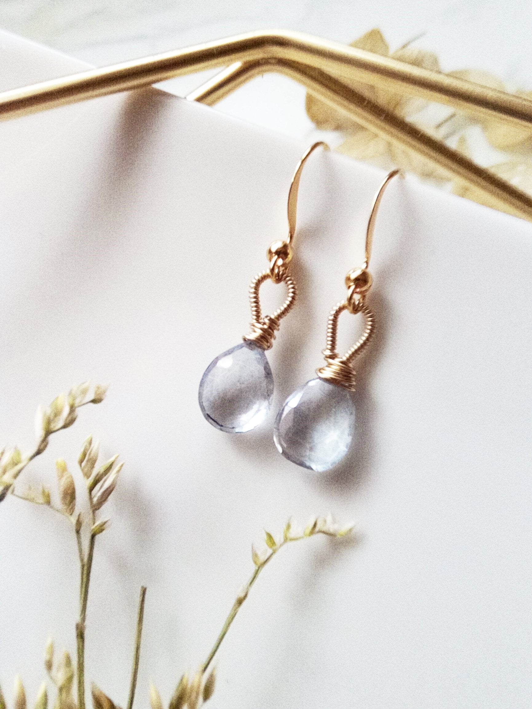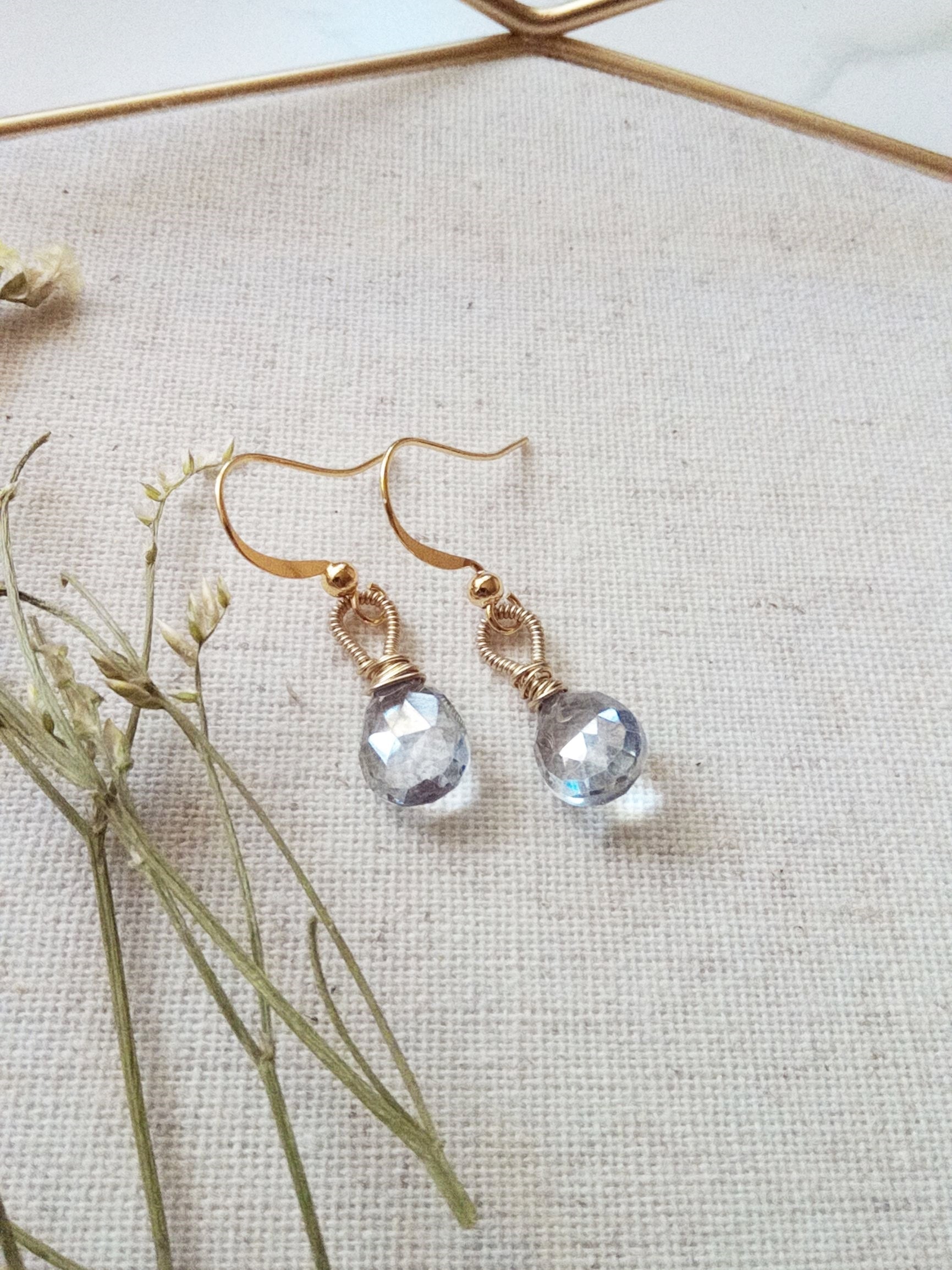 This elegant blue mystic topaz faceted briolette, wire wrapped in delicate gold-filled wire, makes a stunning bridesmaid gift or “something blue” for a beach wedding. Its shimmering blue hues capture the essence of ocean waves, adding a subtle yet meaningful touch to your bridal party’s look. Expertly crafted, this piece combines refined beauty with a personal sentiment, perfect for celebrating special moments by the sea. Suspends off Gold Filled earrings.