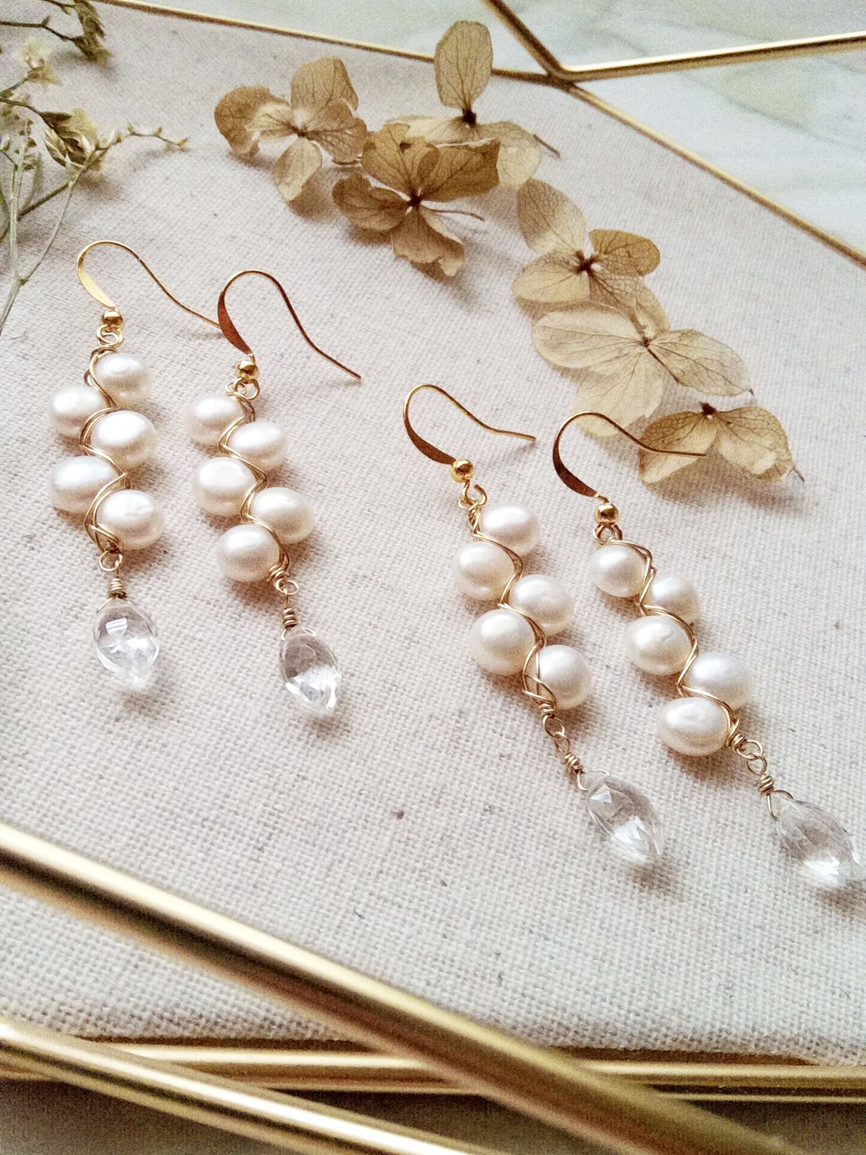 Experience a dramatic statement piece featuring freshwater pearls intricately wire-wrapped in radiant gold-filled wire. The unique design is elevated by a juicy clear quartz briolette drop, adding an elegant sparkle that captures light with every movement. This expert craftsmanship blends natural beauty with refined artistry, perfect for those who appreciate bold yet sophisticated jewelry. Suspends off a gold filled ear wire.