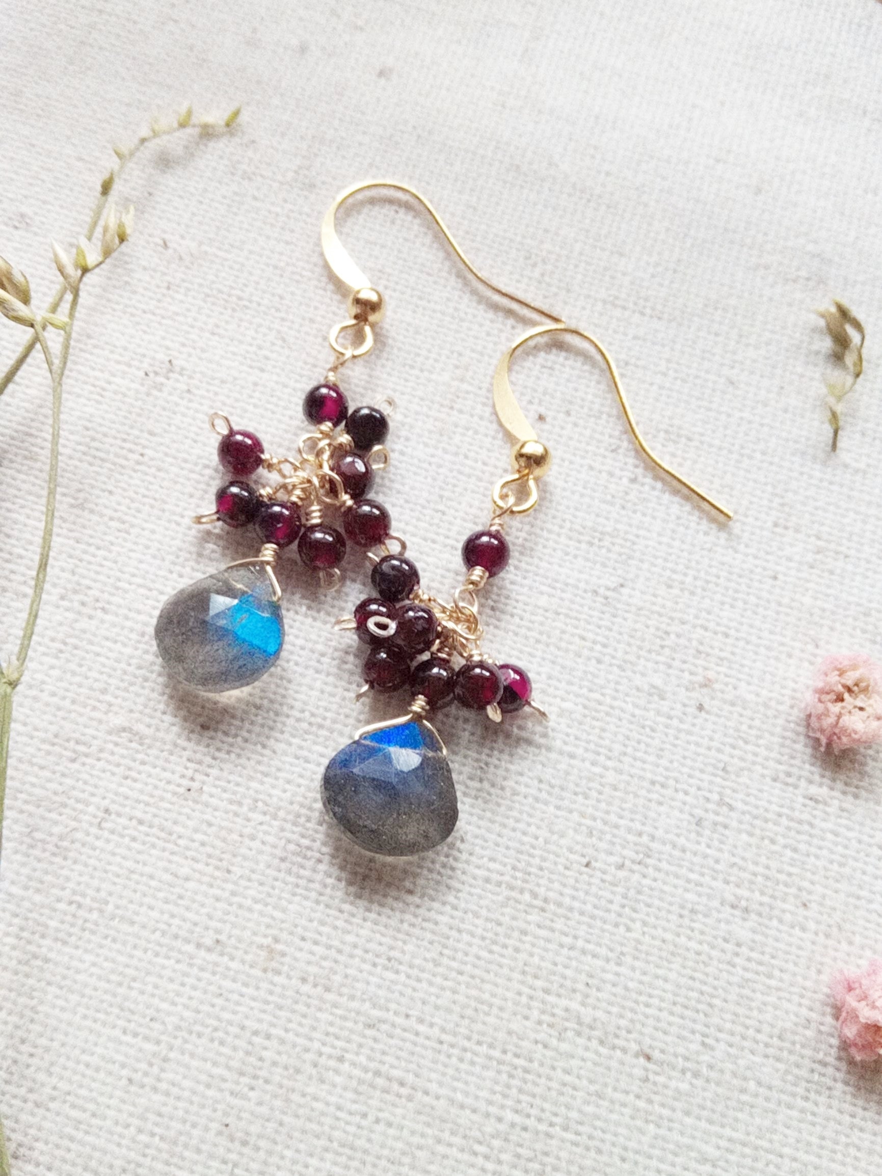 Fiery Blue Flash Labradorite and Garnet Gold Filled Earrings E140058
