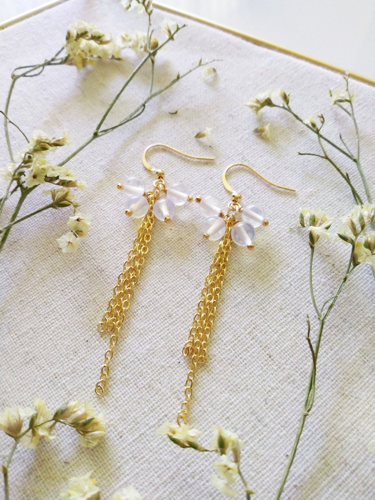 Crafted with an expert eye for detail, these Opal Glass Cluster Gold Filled Earrings feature a delicate gold chain dangle that enhances the ethereal glow of opal glass clusters. Lightweight and elegantly designed, they offer a sophisticated touch suitable for both everyday wear and special occasions, combining timeless style with subtle movement for a refined statement. Suspends off a gold filled ear wire.