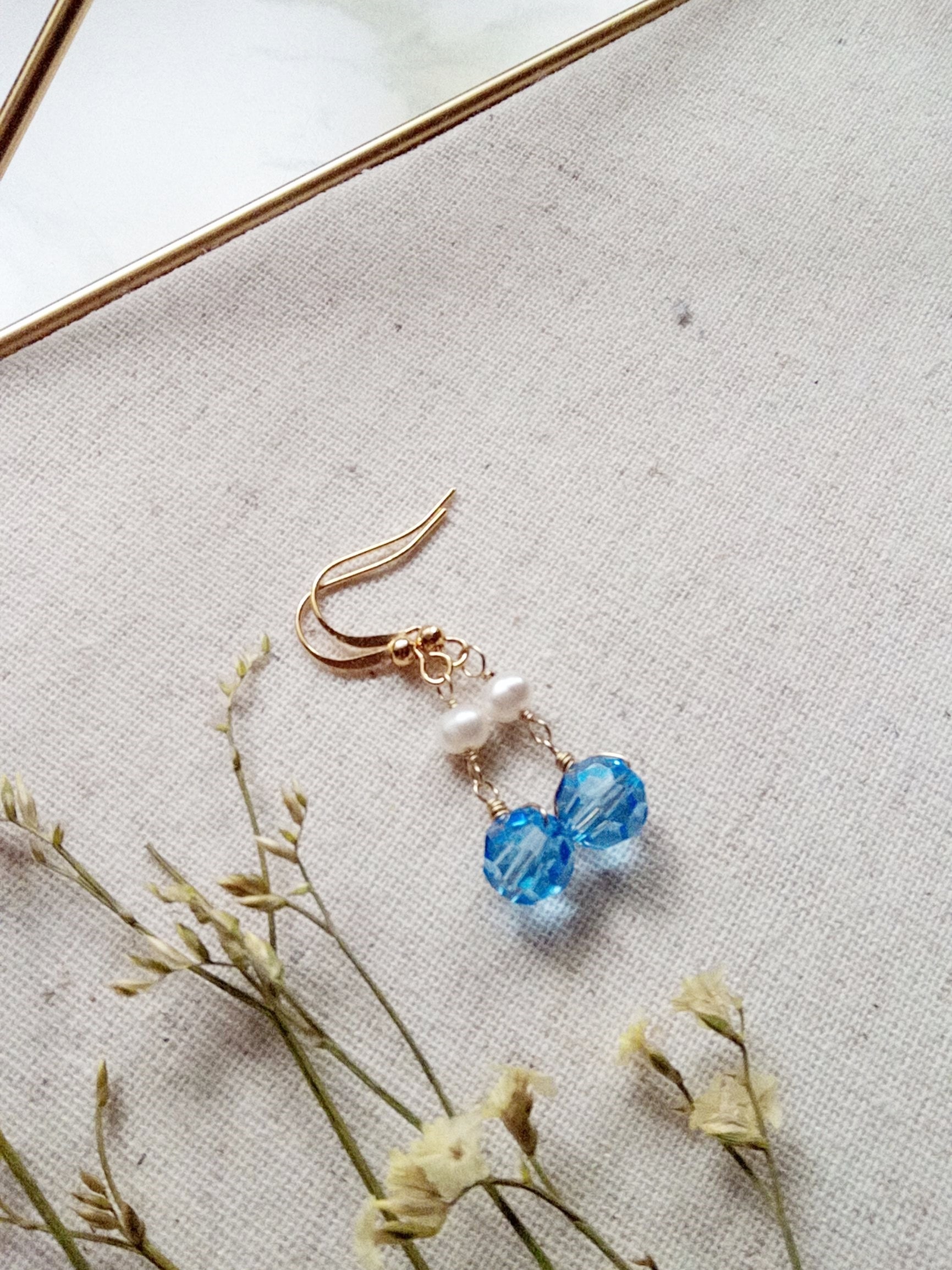 These elegant gold-filled earrings feature dazzling blue sapphire Austrian crystals beautifully accented with lustrous freshwater pearls. Perfectly suited for a beach-themed wedding, they offer a refined touch of ocean-inspired sophistication. Ideal as a thoughtful gift for bridesmaids, these earrings blend timeless elegance with a subtle nautical charm. It suspends off a gold filled earrings.