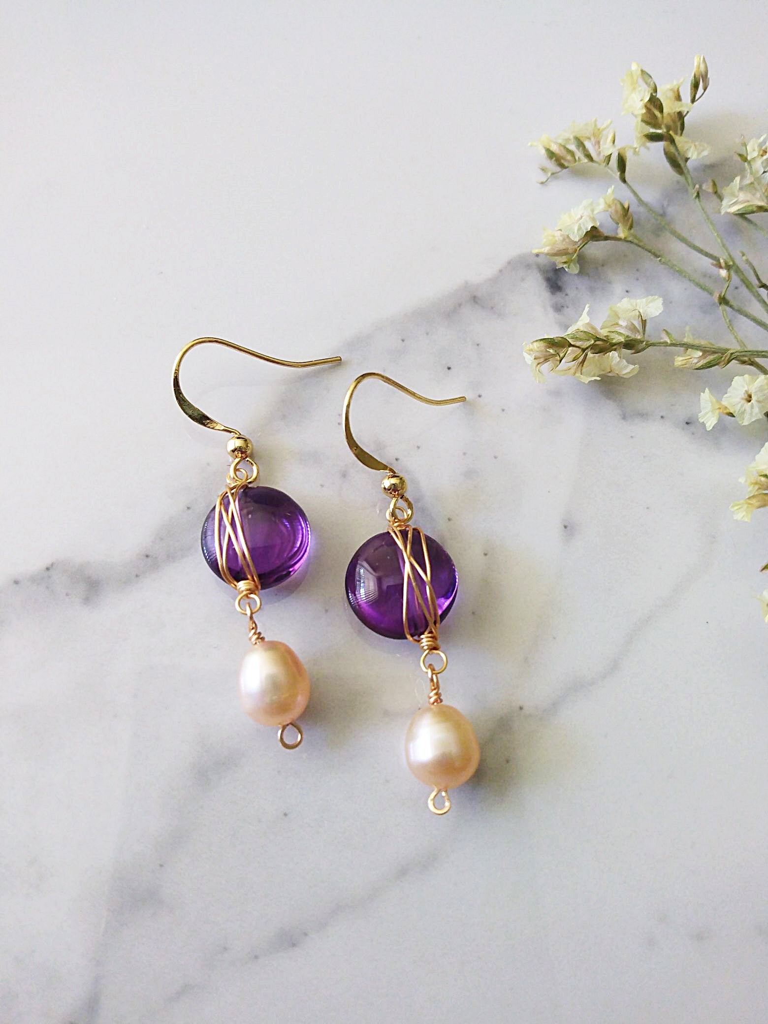 These elegant earrings feature soft ballet pink freshwater pearls paired with smooth amethyst coin gemstones, wire-wrapped in a distinct design that highlights their natural beauty. Crafted with gold-filled materials, they offer both durability and a refined finish, perfect for adding a sophisticated touch to any ensemble. Suspends off a gold filled ear wire.
