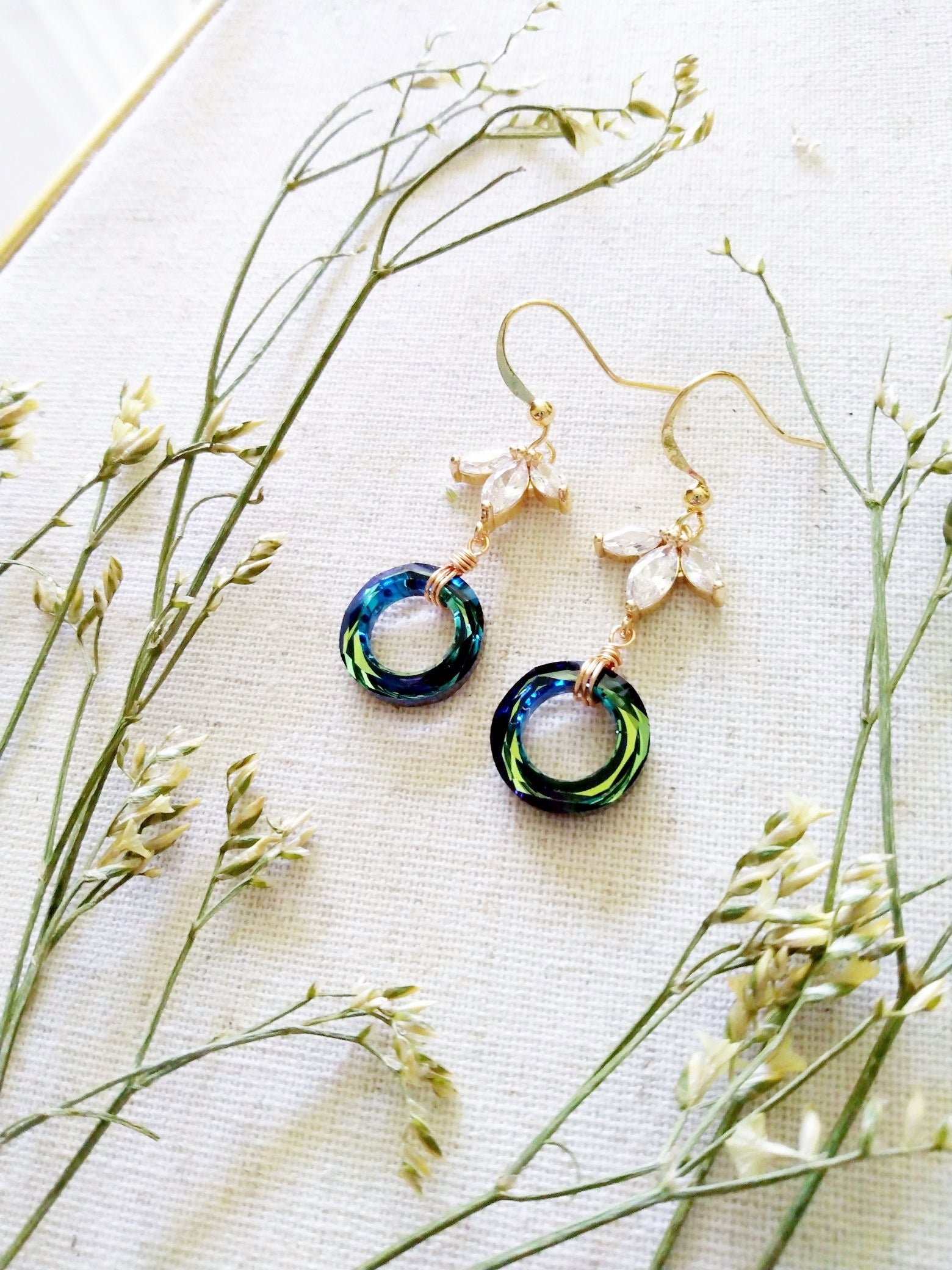 Capture the essence of coastal elegance with these Bermuda Blue crystal earrings, featuring delicate cubic zirconia flower dangles and an Austrian Crystal. Perfect for a beach wedding, they add a subtle yet sparkling "something blue" touch to your ensemble. Their playful and flirty design makes them an ideal bridesmaid gift, combining charm with a refined finish that complements any ocean-inspired celebration. Suspends off a Gold Filled earrings.