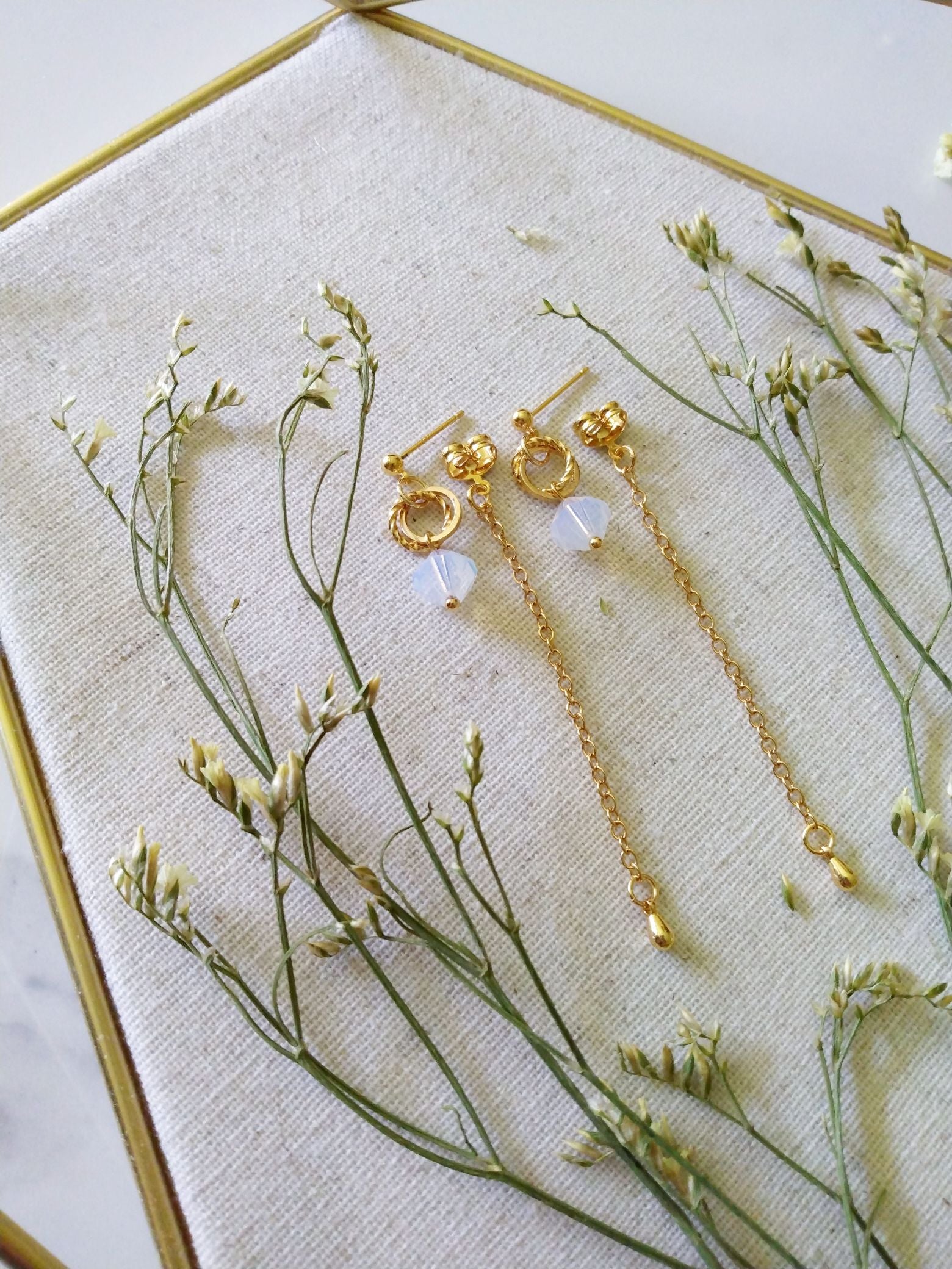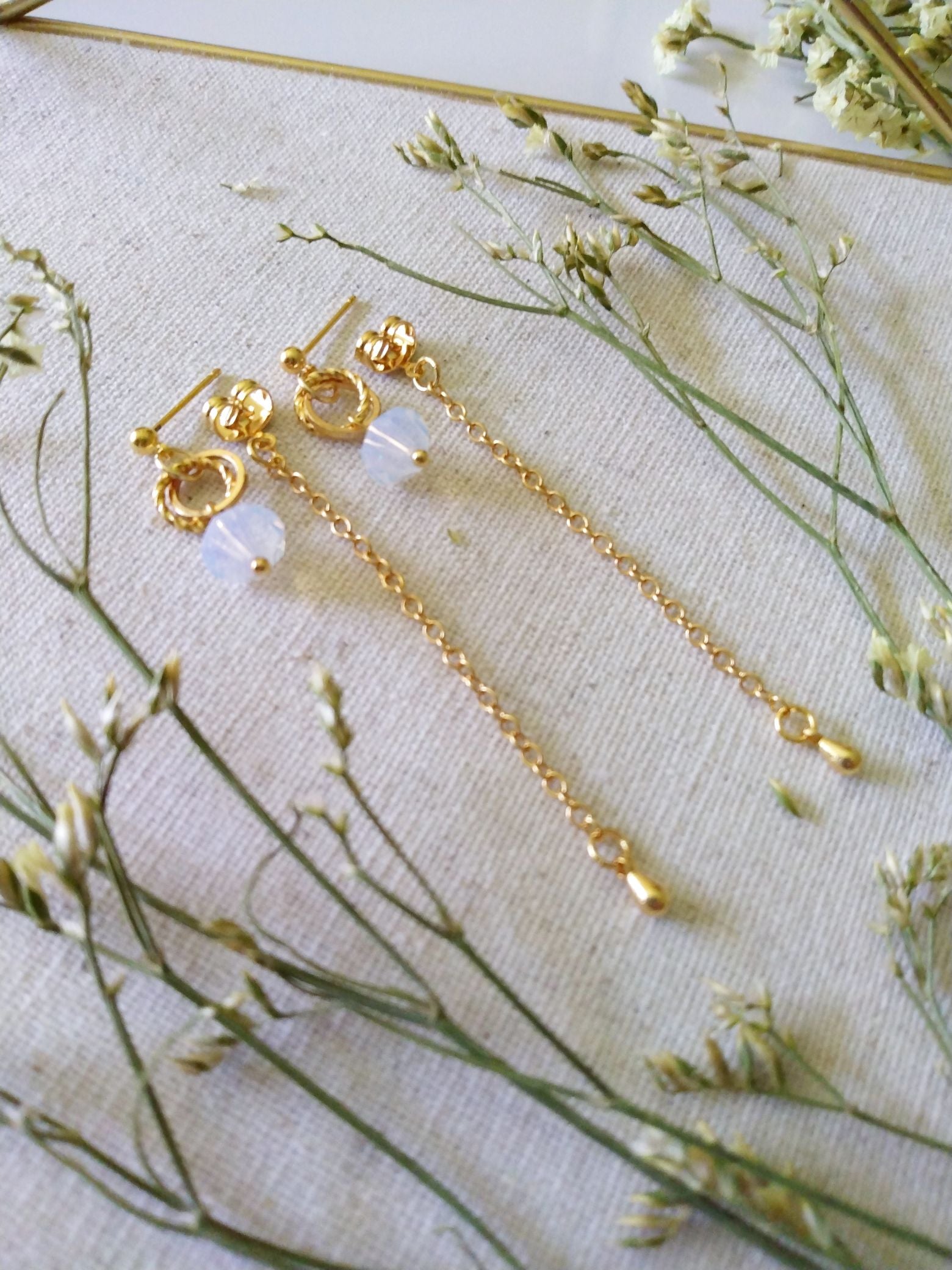 These elegant earrings feature a versatile design allowing them to be worn two ways, offering both short stud dangle and long dangle styles. Crafted with an opal-finished Austrian crystal that captures light beautifully, each piece is accented by a delicate chain in a soft gold filled finish. This combination delivers refined sophistication and adaptability, perfect for elevating both everyday and special occasion looks. Suspends off gold filled earrings. Comes with two different earring backs. One with the chain backing and another without.