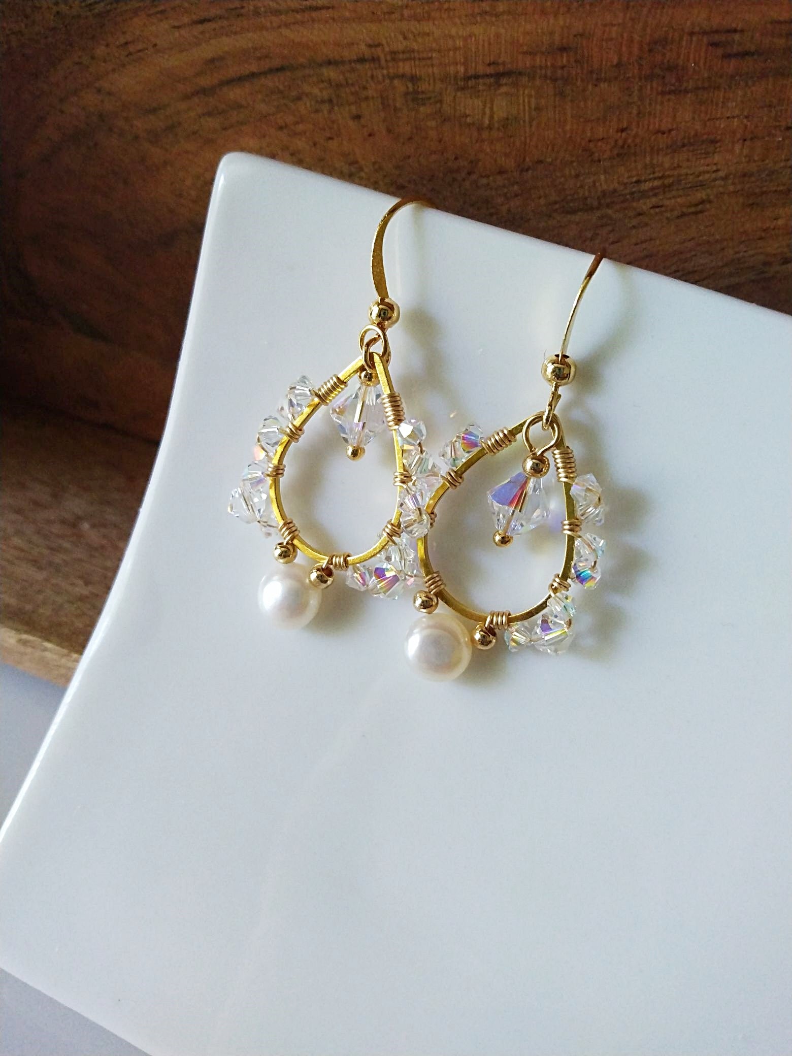 These elegant bridal earrings feature off white pearls paired with delicate crystals, wire-wrapped into a graceful teardrop shape. Crafted from gold-filled material, they offer lasting shine without the risk of tarnish. Perfect for adding a refined, timeless touch to your wedding ensemble. Suspends off Gold Filled earrings.