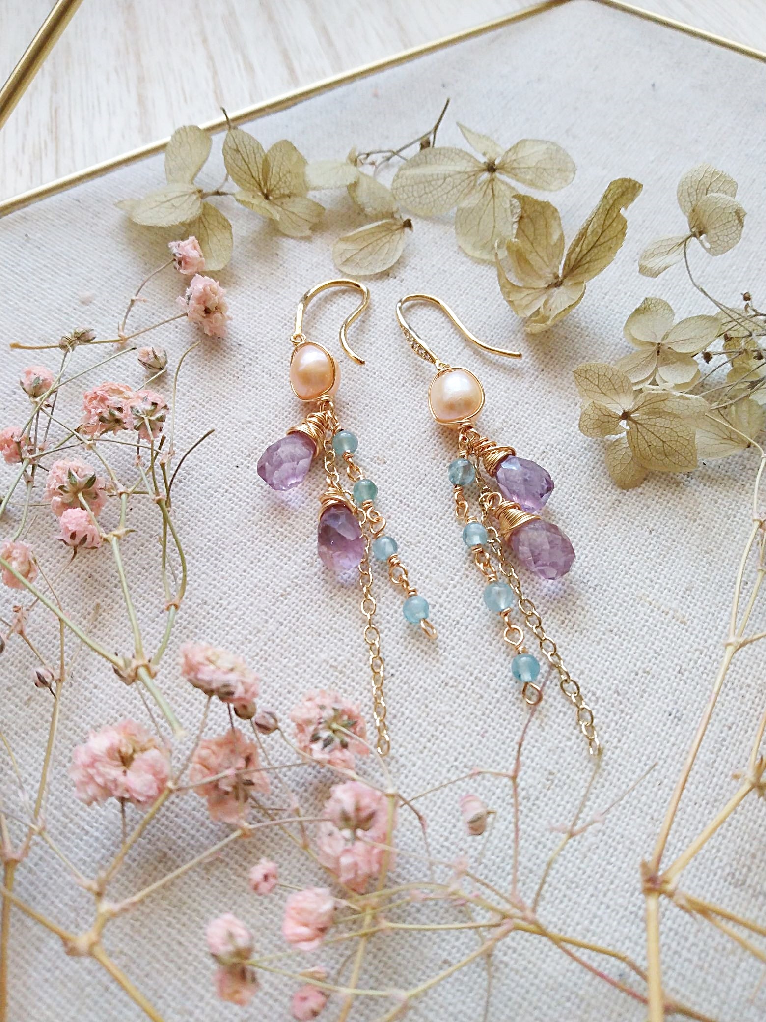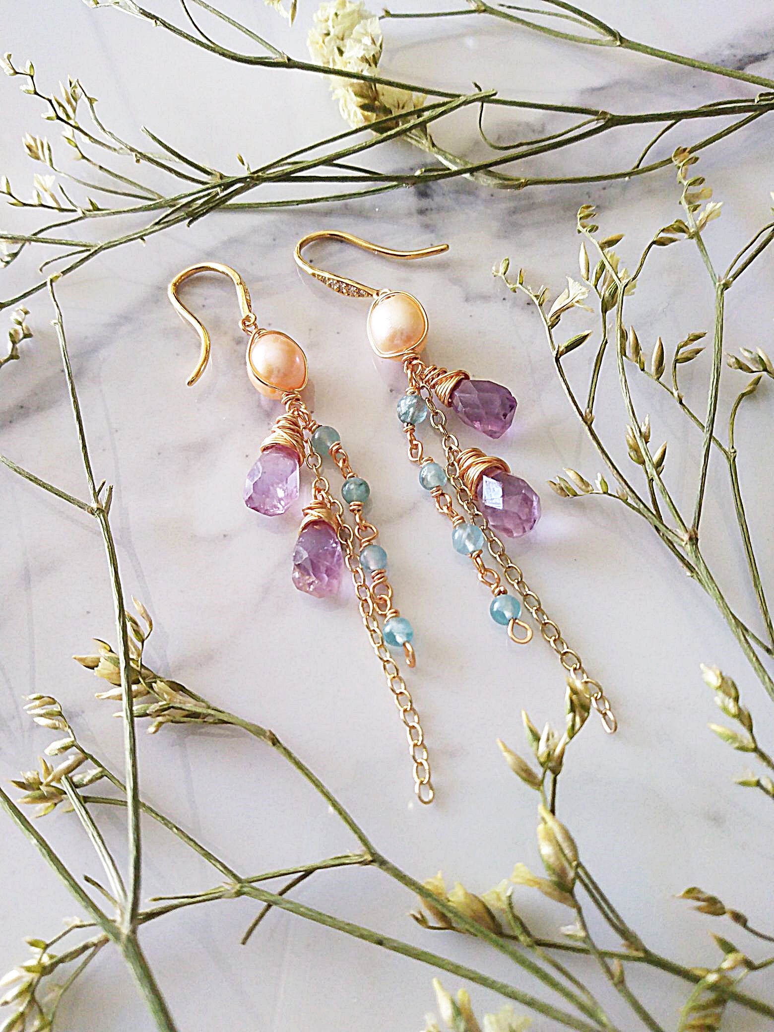 These elegant earrings features rustic hand-faceted amethyst gemstones complemented by delicate aquamarine droplets and a freshwater pearl focal point. Suspended on a thin chain, it offers a long dangle design that gracefully swings as you move, making it a refined choice for romantic and sophisticated styles. Suspends off a cubic zirconia embedded gold plated earrings.
