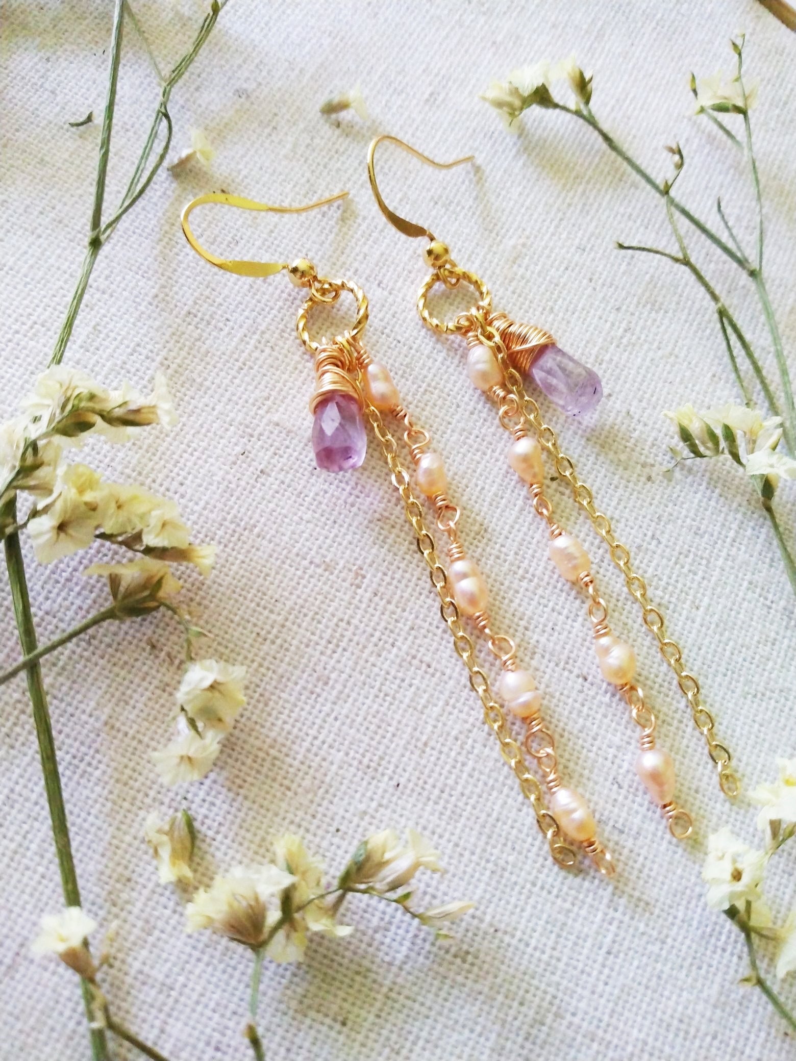 Elevate your elegance with this exquisite piece featuring baby pink baroque pearls paired with rustic hand-faceted amethyst briolettes. The long slender dangle design creates a delicate balance of romantic charm and sophisticated style, perfect for making a refined statement on any occasion. Suspends off a Gold Filled Earring.
