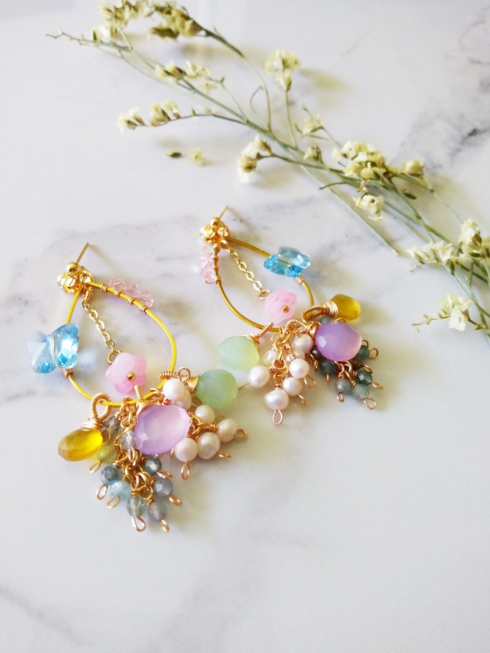 These gold-filled earrings feature a sophisticated cluster design combining semi-precious chalcedony gemstones in various colors, apatite, and freshwater pearls along with sparkling Austrian crystals and Czech glass. The large, multi-gemstone bouquet is arranged in a romantic floral motif, creating eye-catching dangles with graceful movement. Perfectly balancing elegance and vibrant color, these earrings offer a refined yet bold accessory for special occasions or elevating everyday looks. Suspends off a Gold Filled Earring.