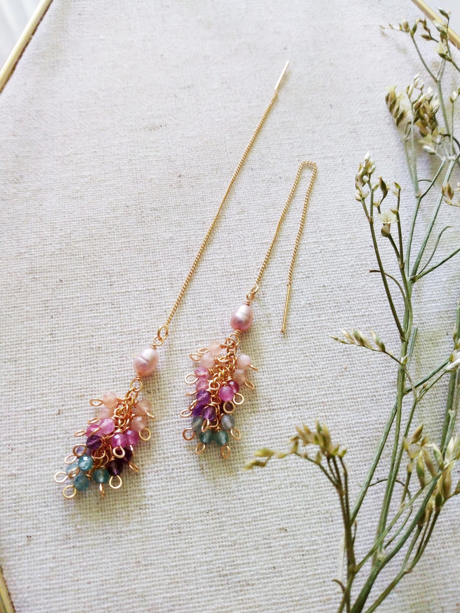 Adjustable Long Pearl Tourmaline Pink Opal Apatite Amethyst Gold Filled Earrings E140166