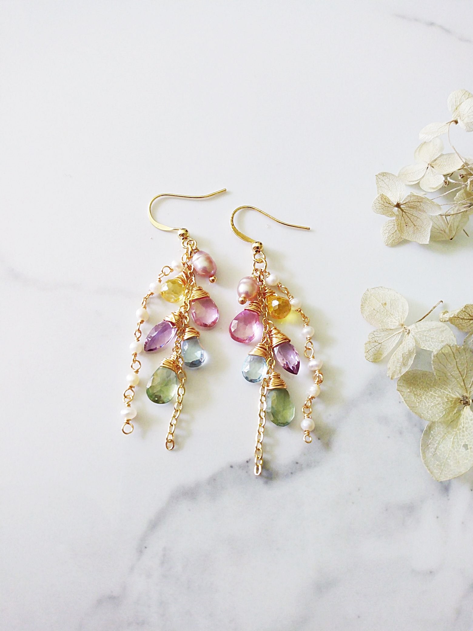 Discover a stunning collection of nature’s treasures featuring an array of gemstones in diverse colors, sizes, and cuts that beautifully reflect light. This selection includes radiant yellow citrine, soft mauve pearl, delicate pink topaz, gentle pink amethyst, calming aquamarine, and vibrant green quartz, each showcasing unique facets that enhance their natural brilliance. Perfect for expert collectors and jewelry designers seeking pieces that combine elegance with the enchanting play of light. Suspends off a Gold Filled Earring.