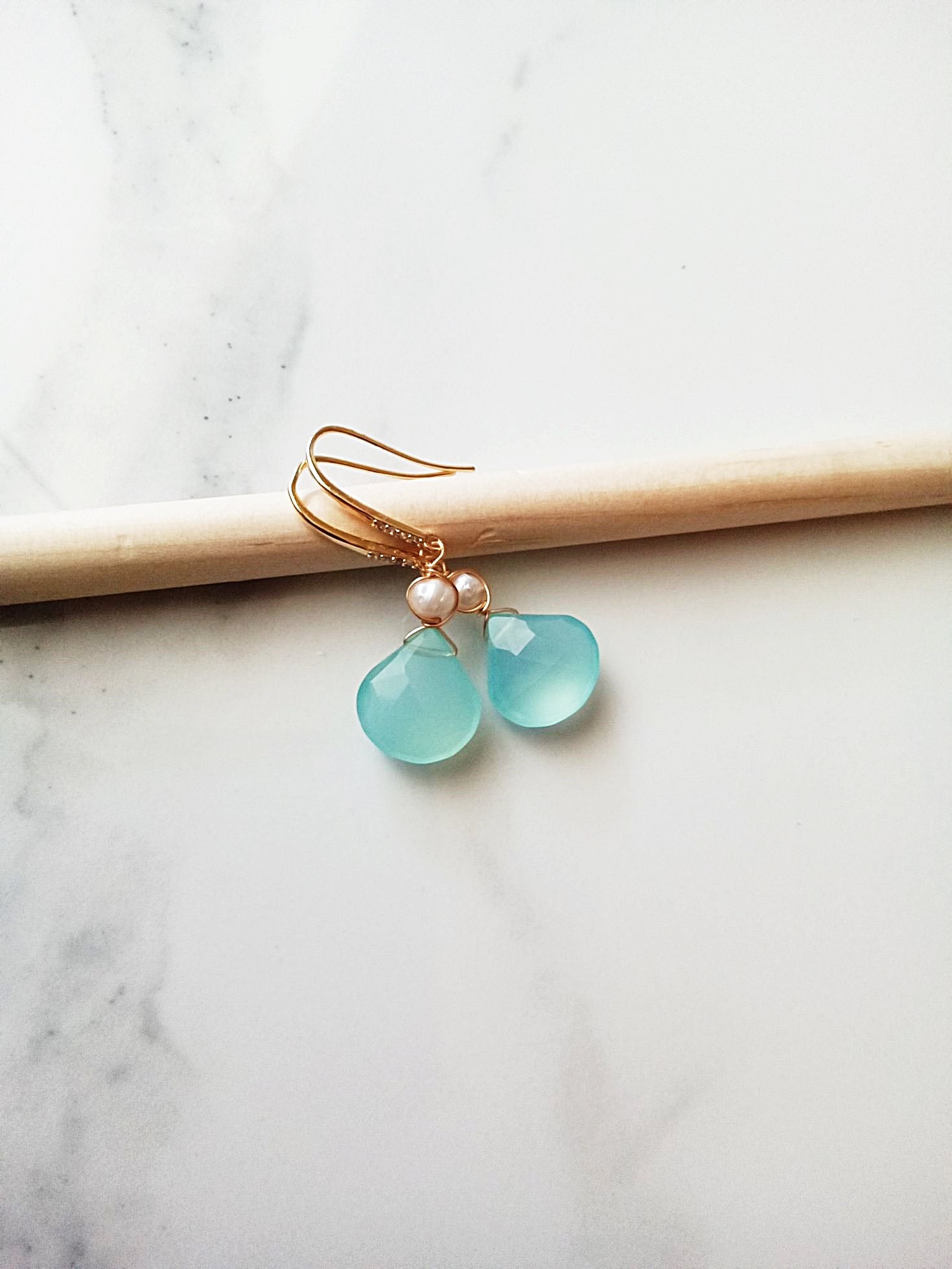 Blue Chalcedony Gemstone Freshwater Pearl Gold Earrings E140018