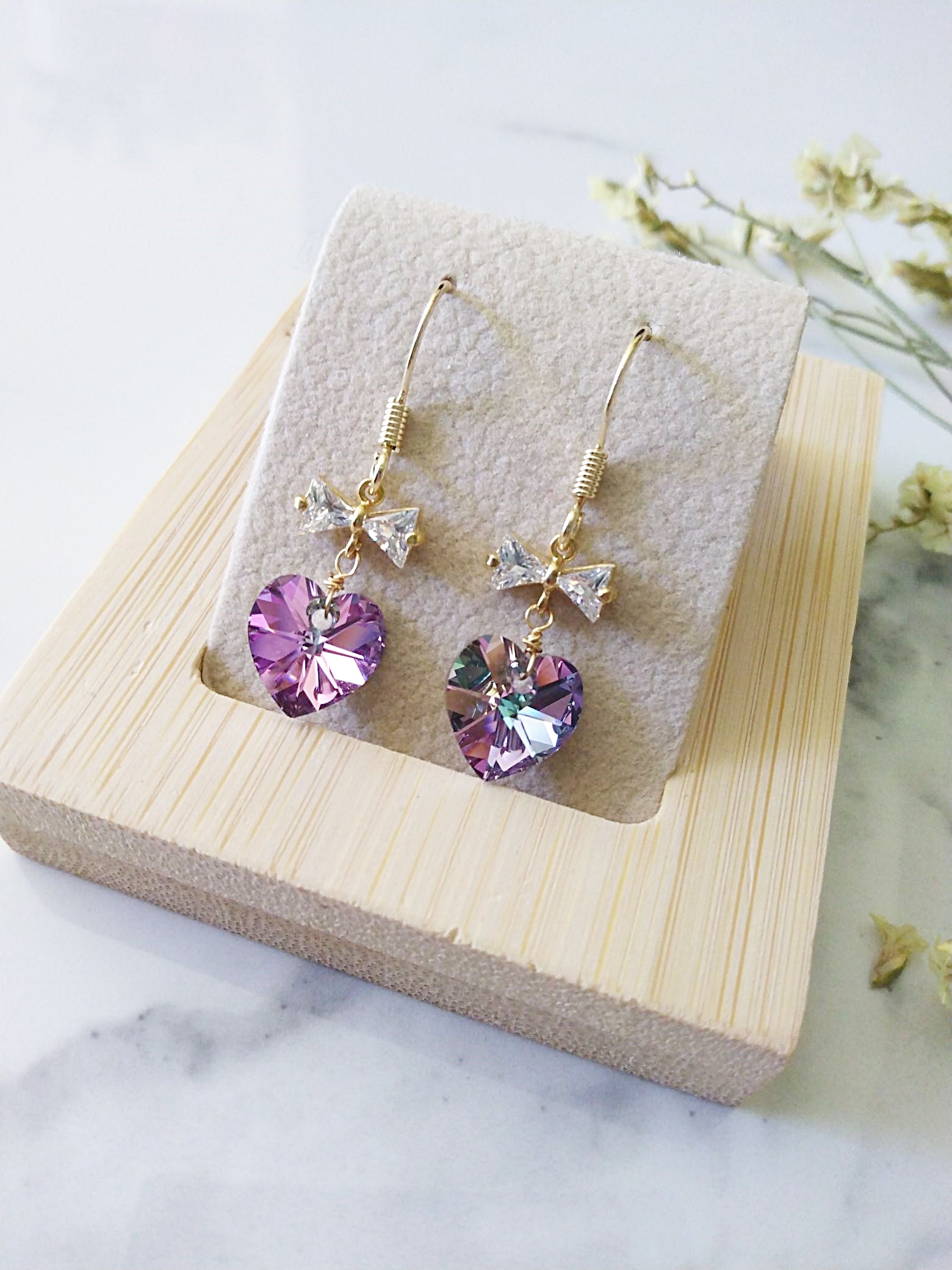 These exquisite Gold Heart and Bow Crystal Earrings feature delicate Austrian crystals, offering a sweet and dainty design perfect for bridesmaid gifts. Handmade with care, their refined craftsmanship ensures elegance and charm, making them a timeless accessory for special occasions. Suspends off a gold plated earring.