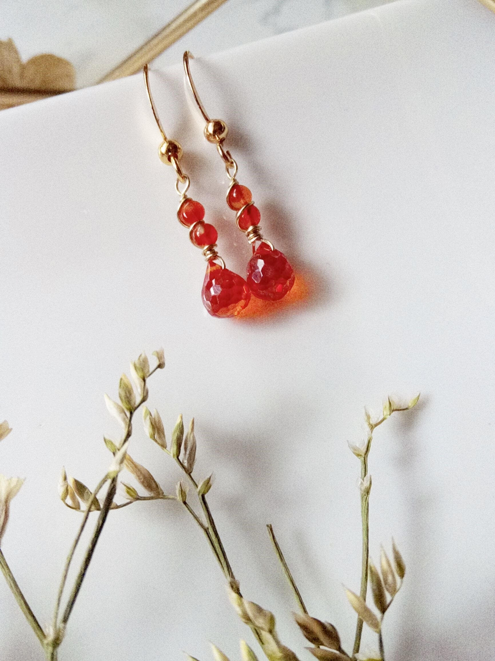 This delicate piece features vibrant orange cubic zirconia and warm carnelian gemstones, meticulously hand wire wrapped with gold-filled wire. Each element is carefully crafted to highlight the stones' natural beauty while ensuring durability and refined elegance, ideal for those seeking a subtle yet sophisticated accessory. Suspends off a gold filled Ear wire.