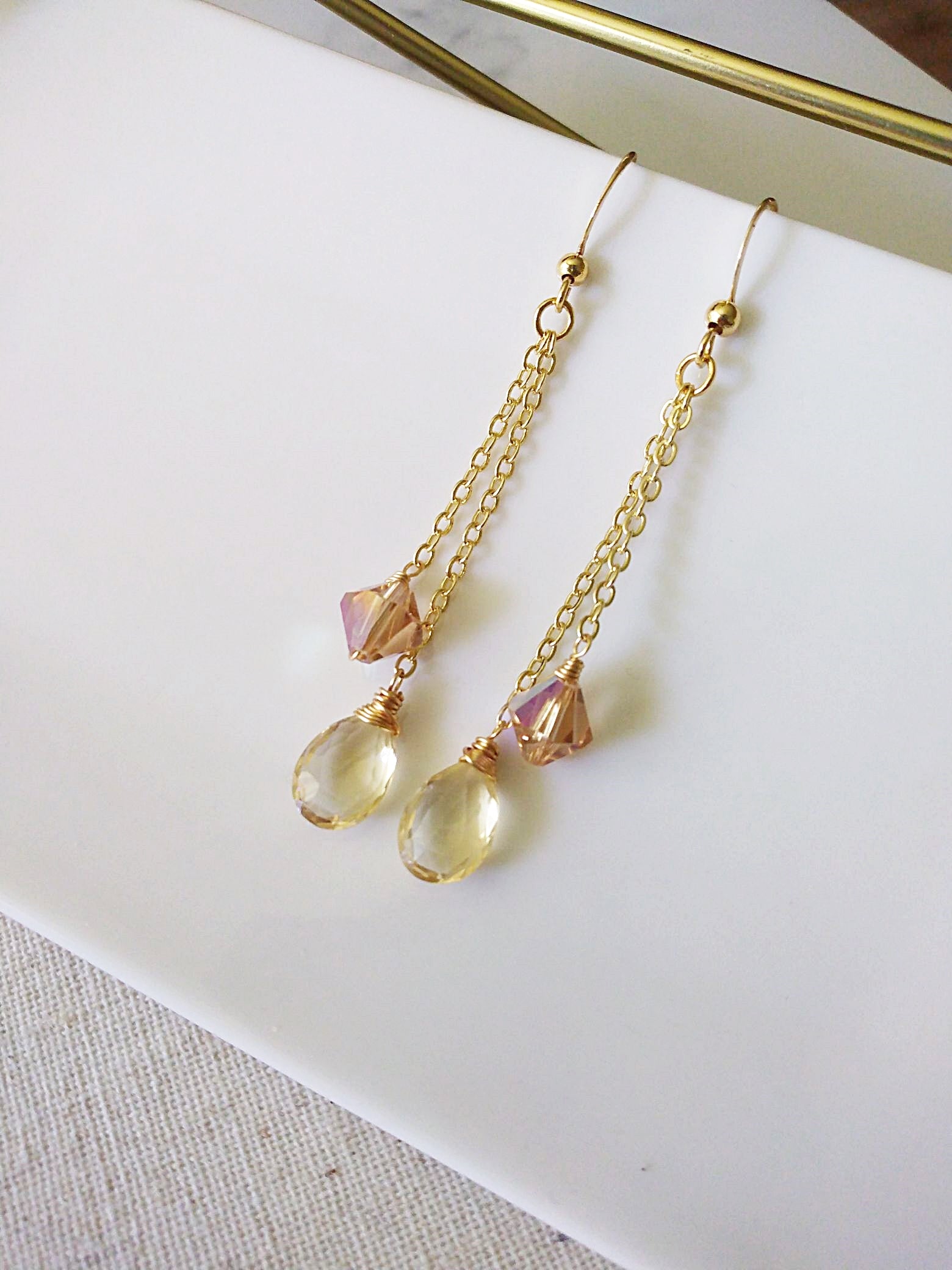 Elevate your style with these expertly handcrafted long dangle earrings, featuring natural citrine gemstones set in gold-filled metal for lasting brilliance. Accentuated with sparkling Austrian crystals in bronze finish, they blend timeless elegance with artisan craftsmanship. Perfect for adding a sophisticated touch to any outfit. Suspends off a gold filled earring.